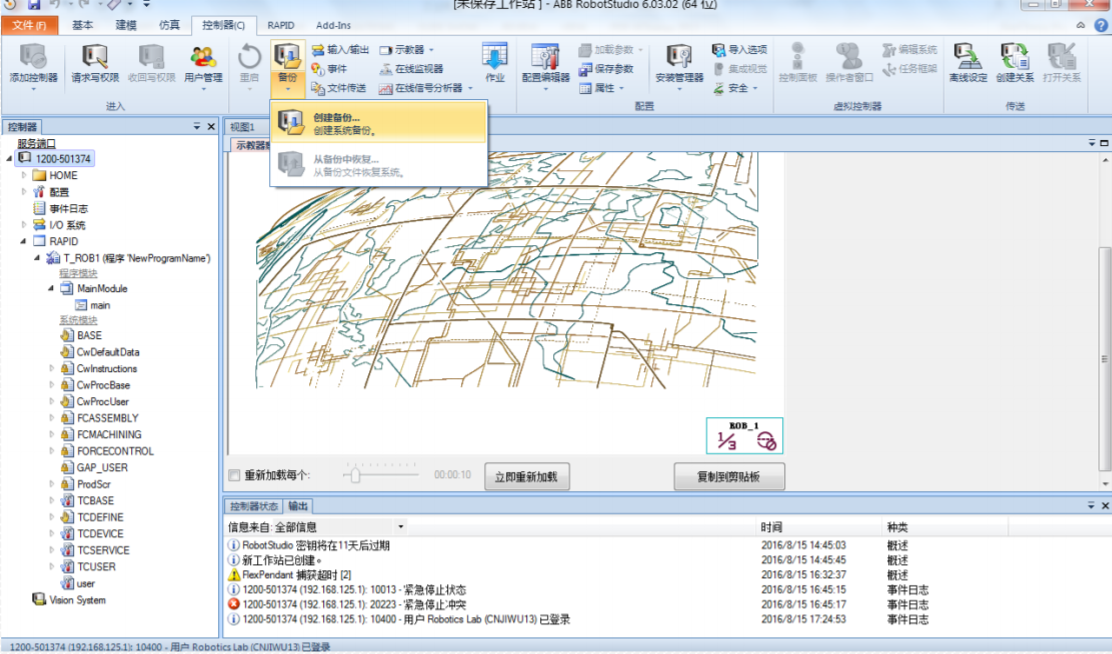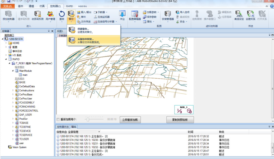 - 与机器人建立连接,切换到手动,请求写权限,点检备份,选择从备份中恢复: